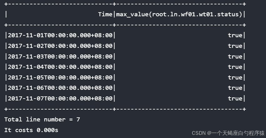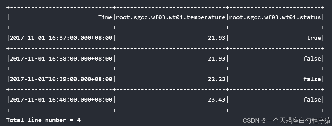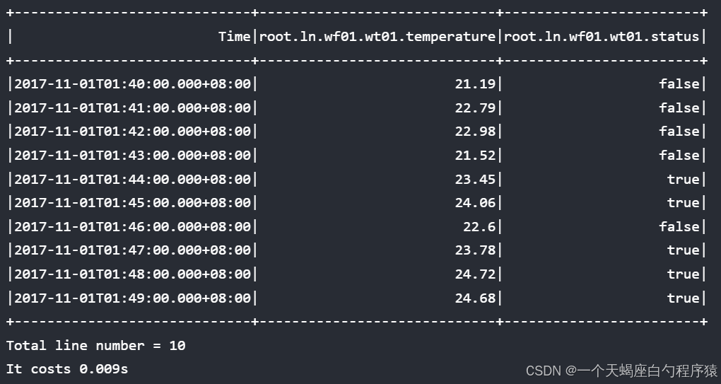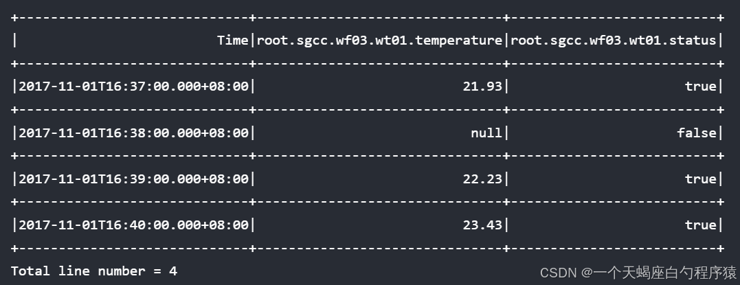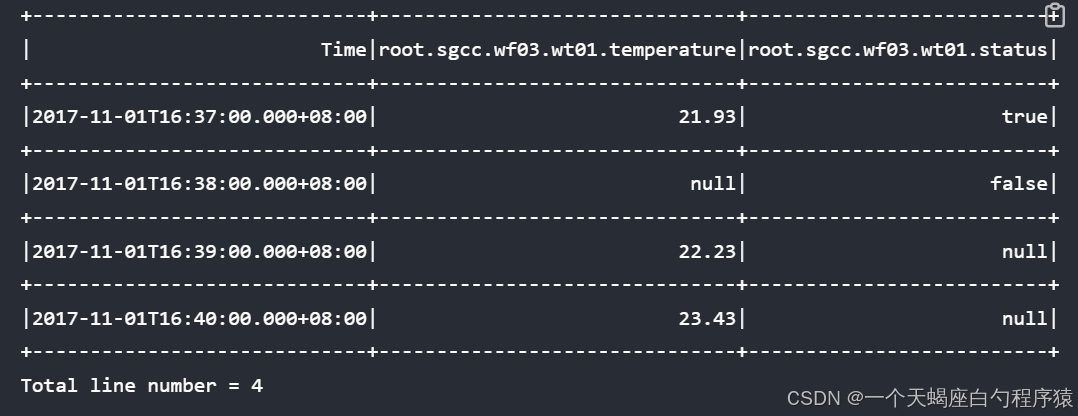 | Time|count(root.ln.wf01.wt01.status)|max_value(root.ln.wf01.wt01.temperature)|