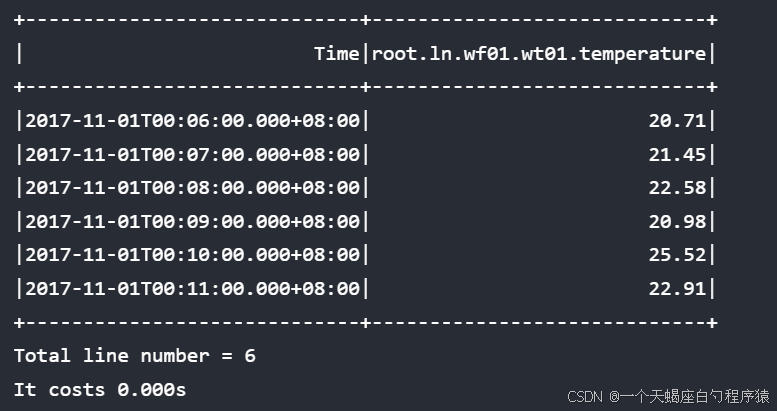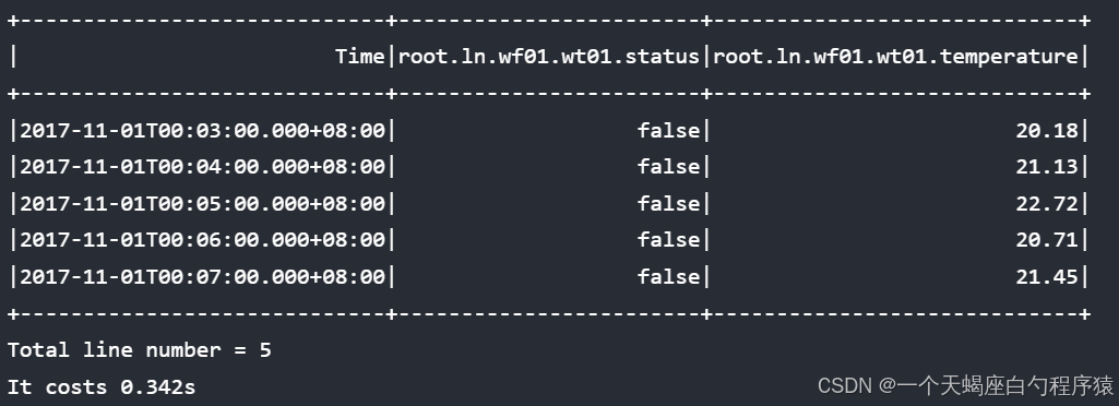 所选设备为 ln 组 wf01 工厂 wt01 设备; 所选时间序列是该设备下的第二列,即温度。 SQL 语句要求在"2017-11-01T00:05:00.000"和"2017-11-01T00:12:00.000"的时间点之间选择温度传感器值。