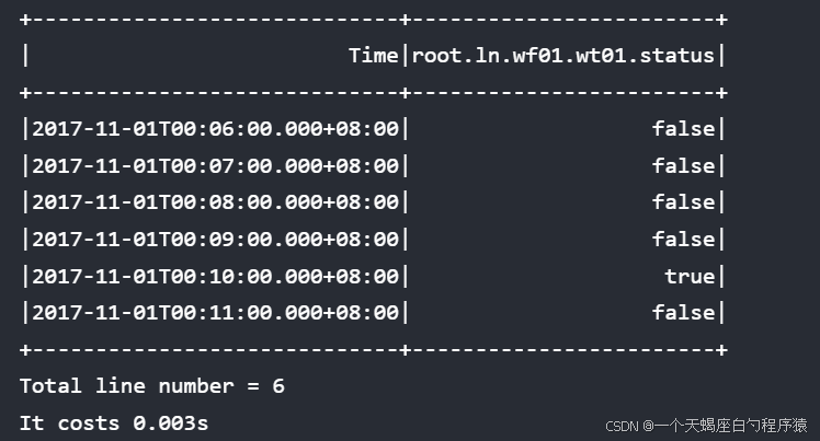 所选设备为 ln 组 wf01 工厂 wt01 设备; 所选时间序列是此设备下的第 0 列至第 1 列(第一列编号为第 0 列)。 SQL 语句子句要求返回查询结果的第 100 至 109 行(第一行编号为 0 行)。