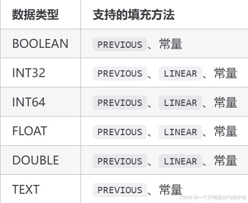 各数据类型支持的填充方法如下表所示: