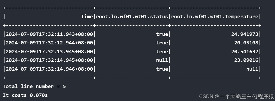 所选设备为 ln 组 wf01 工厂 wt01 设备; 选择的时间序列是"状态"和"温度"。 SQL 语句要求返回时间" 2024-07-07T00:05:00.000"和" 2024-07-12T00:12:00.000"之间的状态和温度传感器值的第 3 至 7 行(第一行编号为第 0 行)。