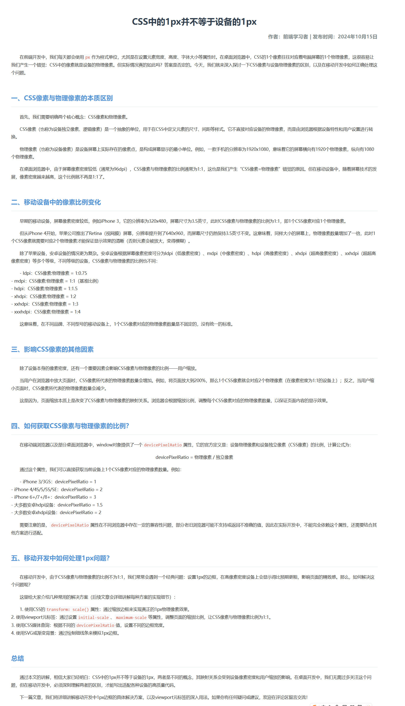 通过本文的讲解,相信大家已经明白:CSS中的1px并不等于设备的1px,两者是不同的概念,其映射关系会受到设备像素密度和用户缩放的影响。在桌面开发中,我们无需过多关注这个问题,但在移动开发中,必须深刻理解两者的区别,才能写出适配各种设备的高质量代码。