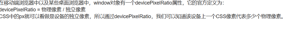 在移动端浏览器以及部分桌面浏览器中,window对象提供了一个<code>devicePixelRatio</code>属性,它的官方定义是:设备物理像素和设备独立像素(CSS像素)的比例,计算公式为: