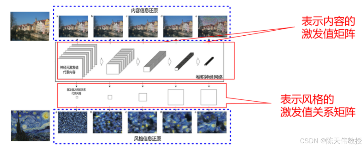 相反,神经元激发值之间的相关性则体现了色彩分布等风格信息(下图下半部分),而且随着网络层次的加深,神经元感受野逐步扩大,所代表的风格信息在空间尺度上也越来越大。