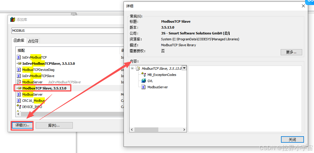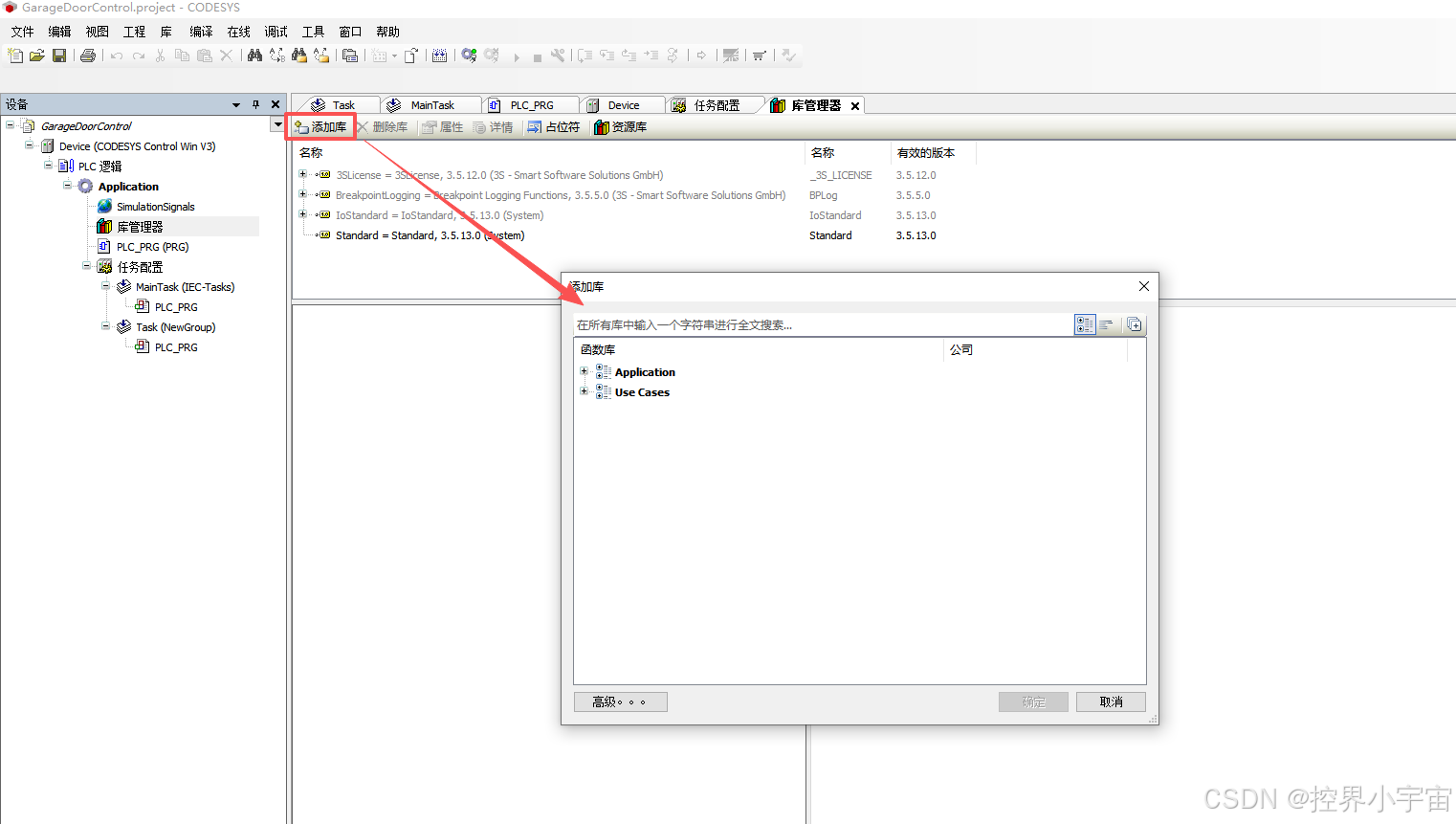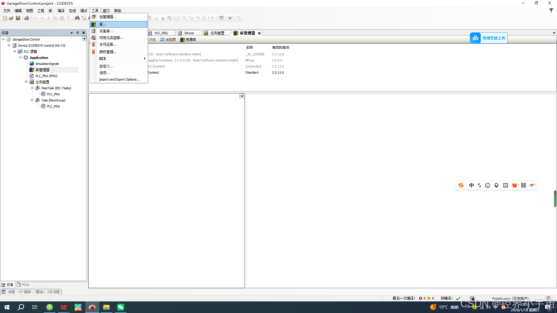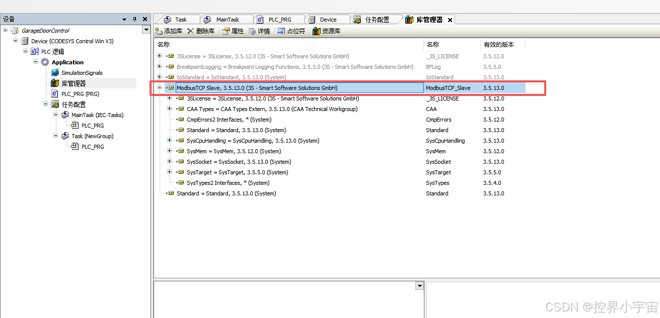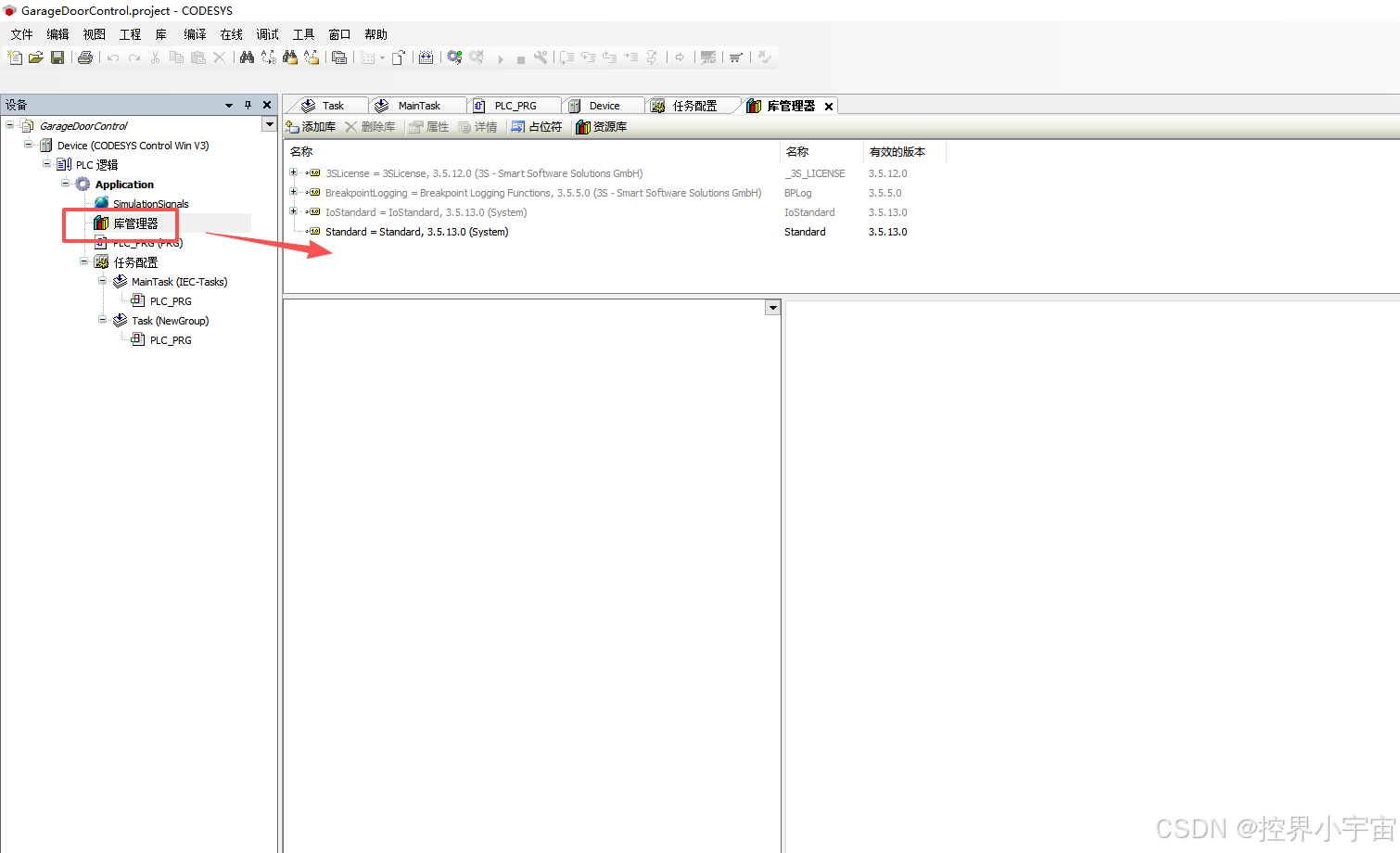 库管理器是CoDeSys中管理库文件的核心工具,可通过"Library Manager"命令打开,用于显示当前项目关联或调用的所有库,包括POU、数据类型、全局变量等信息,且所有库相关配置会与项目一同保存。