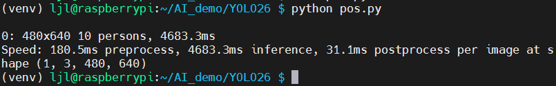 python pos.py指令,对人体姿态进行关键点标注; - 终端打印识别到的人体数量、推理速度、置信度、耗时等信息