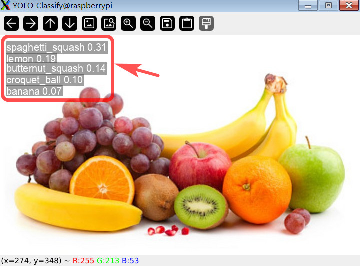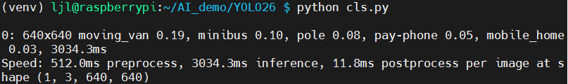 python cls.py指令,对图片目标进行分类; - 终端打印识别到的物体、置信度、耗时、坐标等信息