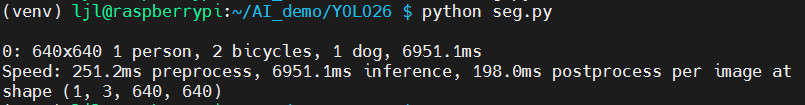 python seg.py指令,对目标进行图像分割 - 终端打印识别到的物体、坐标、耗时等信息