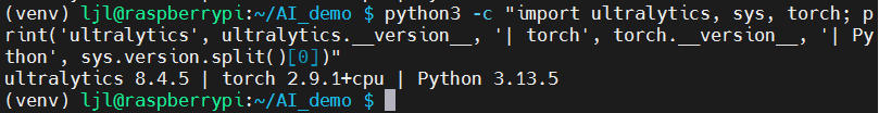 python3 -c "import ultralytics, sys, torch; print('ultralytics', ultralytics.__version__, '| torch', torch.__version__, '| Python', sys.version.split()[0])"