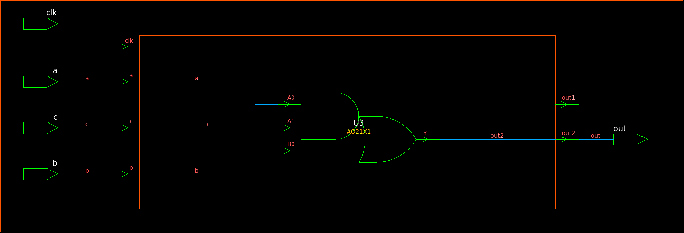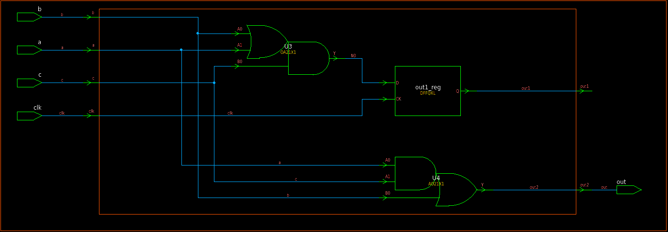 如果使用compile_ultra -no_boundary_optimization命令进行综合(禁止边界优化),则不可读信息无法从层次外部传播到内部,也就是说out1_reg及其扇入的逻辑锥不会被删除,如果使用compile_ultra -no_autoungroup命令进行综合(禁止自动解组),则综合结果如图9所示。