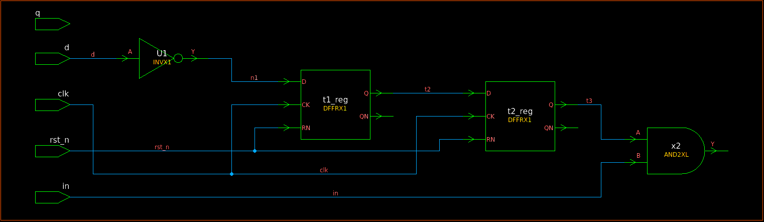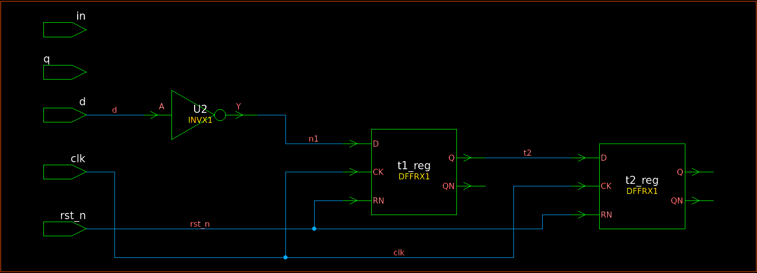 如果把compile_delete_unloaded_sequential_cells变量(默认值为true)设置为false,则综合工具会保留不可读触发器,并将其认定为是可读状态(这样做的话,触发器扇入的逻辑锥也就不会被认定为是间接不可读状态从而删除了),图2展示了将compile_delete_unloaded_sequential_cells变量设置为false后的综合结果。从图中可以看出,组合逻辑门x2被删除了,而其余单元都得以保留。