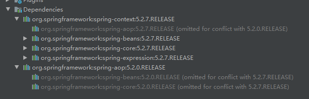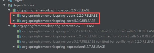 通过查看依赖,我们发现spring-aop和spring-context都依赖了一个叫spring-core的依赖。此时spring-core的版本有两个,这就产生了依赖冲突。