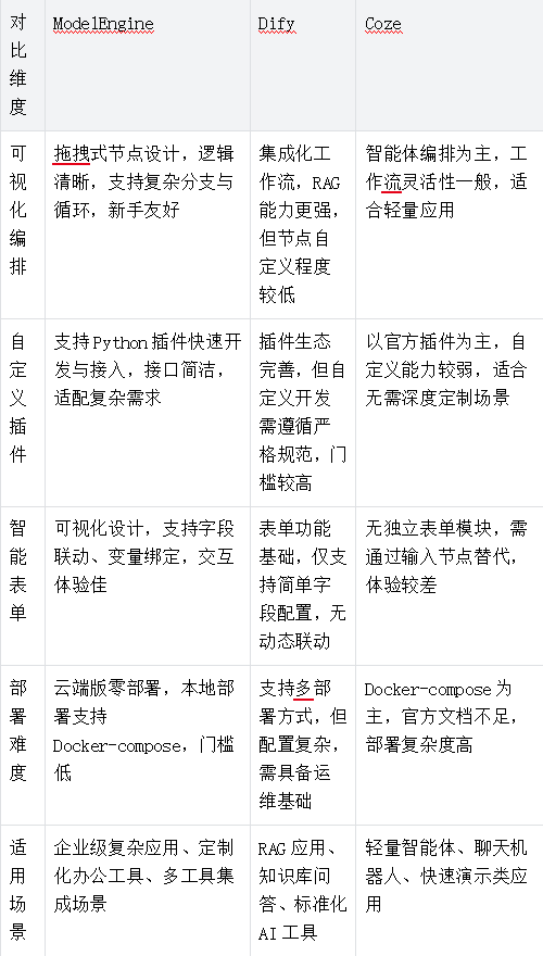 五、多维度对比:ModelEngine vs Dify vs Coze