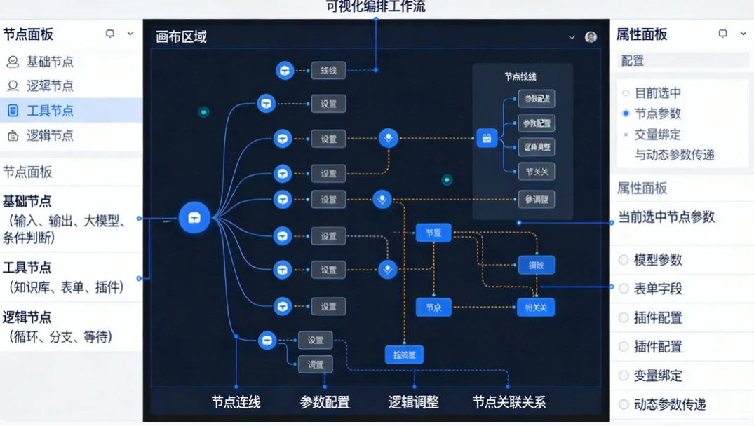 属性面板:配置当前选中节点的参数(如模型参数、表单字段、插件配置),支持变量绑定与动态参数传递。