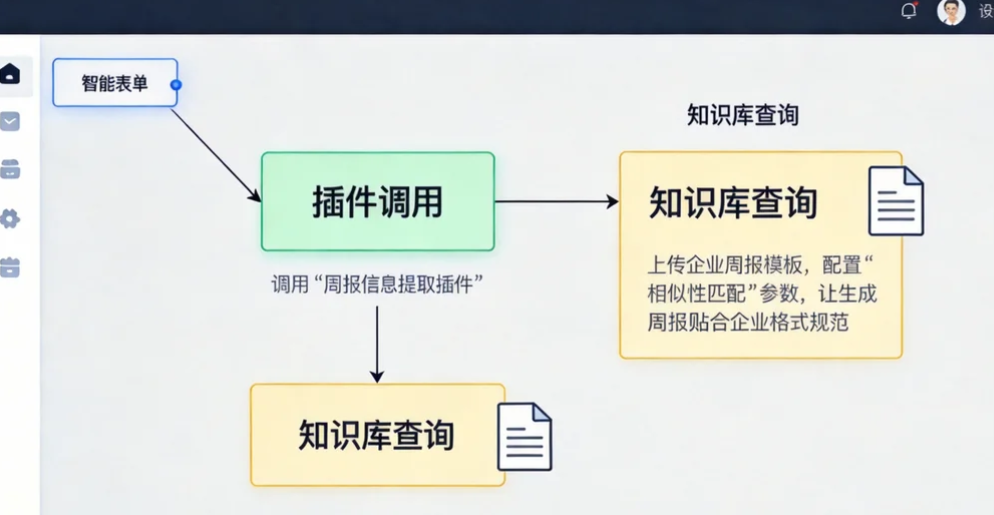 第三步:添加"知识库"节点拖拽"知识库查询"节点,上传企业周报模板(支持Word、PDF格式),配置"相似性匹配"参数,让模型生成的周报贴合企业格式规范。ModelEngine支持知识库自动总结生成,上传文档后无需手动拆分,平台自动提取核心内容构建向量库。