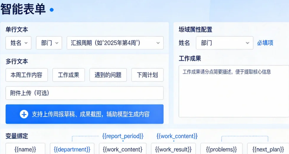 为提升用户体验,可配置表单联动规则:当用户选择"技术部"时,自动添加"本周技术攻坚任务"额外字段;选择"行政部"时,添加"本周行政事务汇总"字段,实现动态表单效果。配置路径:表单设计界面→高级设置→字段联动→添加联动规则。