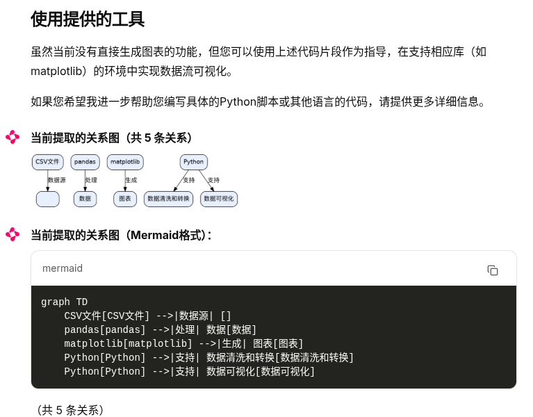 在AI快速发展的今天,如何将文本中的技术信息自动整理成可视化关系图,是很多开发者和数据分析师面临的需求。本文将分享一个完整项目案例------AI关系图生成助手 ,它基于 LangChain 、LangGraph 和 Chainlit 构建,能够自动抽取实体关系三元组并生成 Graphviz 和 Mermaid 可视化图表。