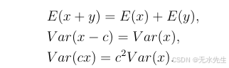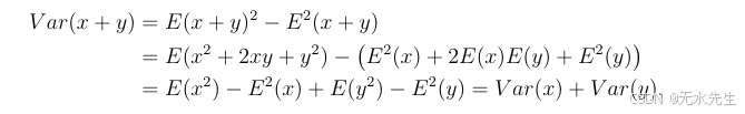 此外,如果x和y相互独立,那么E(xy)=E(x)E(y)E(xy) = E(x)E(y)E(xy)=E(x)E(y)。这些事实意味着,如果x和y相互独立,那么Var(x+y)=Var(x)+Var(y)Var(x + y) = Var(x) + Var(y)Var(x+y)=Var(x)+Var(y),具体推导如下: