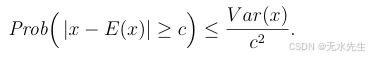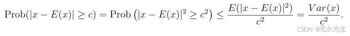 证明:Prob(∣x−E(x)∣≥c)=Prob(∣x−E(x)∣2≥c2)Prob(|x−E(x)| ≥ c) = Prob(|x−E(x)|² ≥ c²)Prob(∣x−E(x)∣≥c)=Prob(∣x−E(x)∣2≥c2) 。令 y=∣x−E(x)∣2y = |x−E(x)|²y=∣x−E(x)∣2。注意到 y 是一个非负随机变量,且 E(y)=Var(x)E(y) = Var(x)E(y)=Var(x),因此可以应用马尔可夫不等式得出: