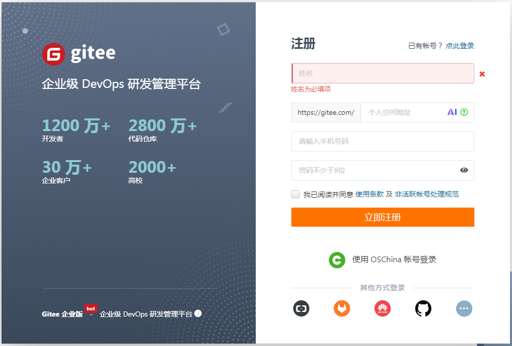 需要注册的访问 gitee用户注册 进行注册,把下面的信息填完提交就可以了。