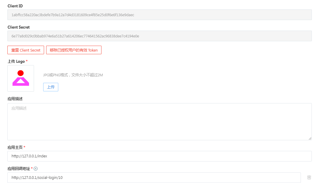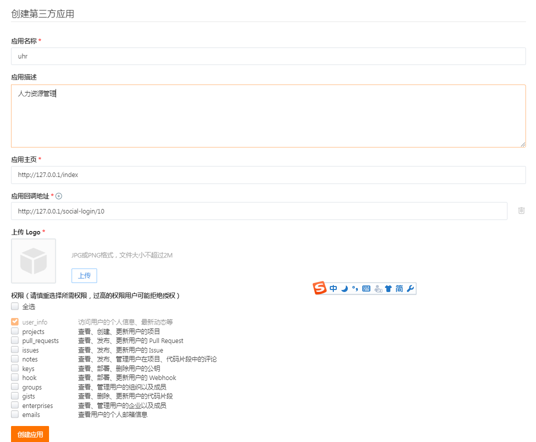 这里需要主要【应用回调地址】要填写正确并与后端配置一致,否则无法通过。提交表单完成应用创建。