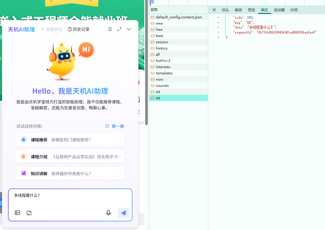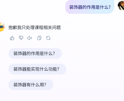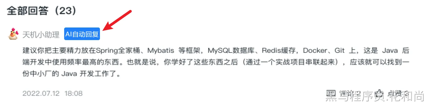 在传统的系统功能中,一般这样的问题,都是其他的同学或者是老师进行回复,往往这样的回复的不及时的,为了解决这个问题,所以,需要进入**AI自动回复**,就是在学生问题发出后,AI进行自动回复。像这样: