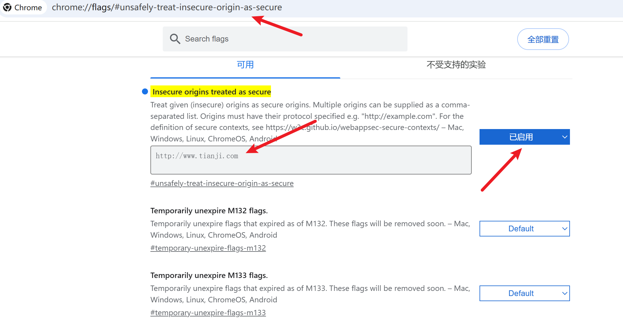 以chrome为例,打开这个:chrome://flags/#unsafely-treat-insecure-origin-as-secure