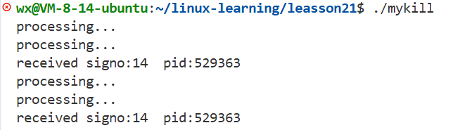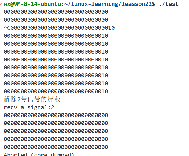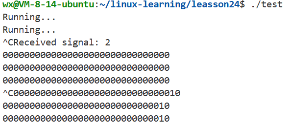 - 所以即使收到2号信号,还是会继续死循环,进程不会退出。