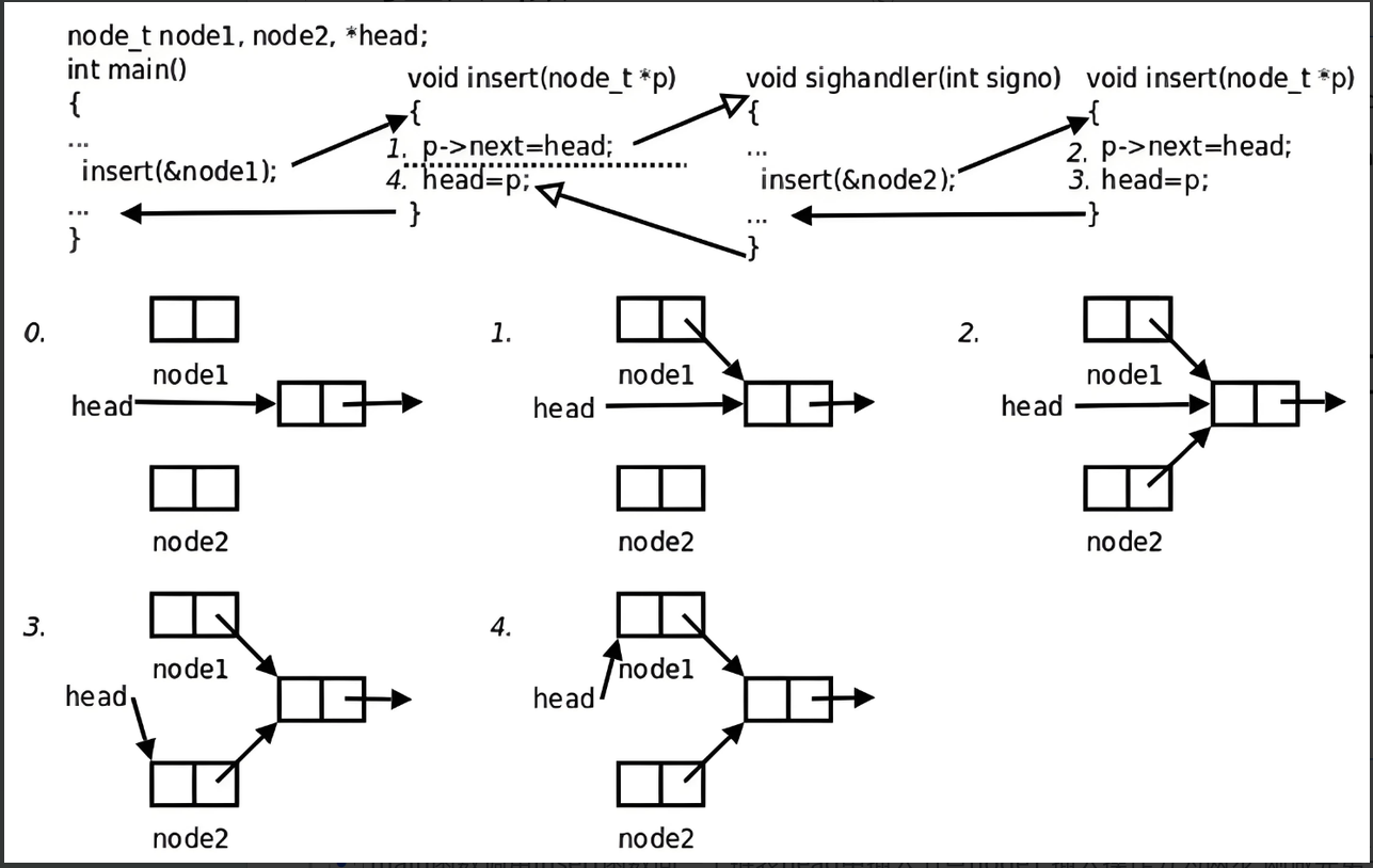 - 上图在插入node1时,在执行head=p之前,进程收到信号,跳转到信号处理函数,而处理函数也需要插入节点,最终导致4号图的出现,node2节点出现了丢失问题,导致内存泄露。