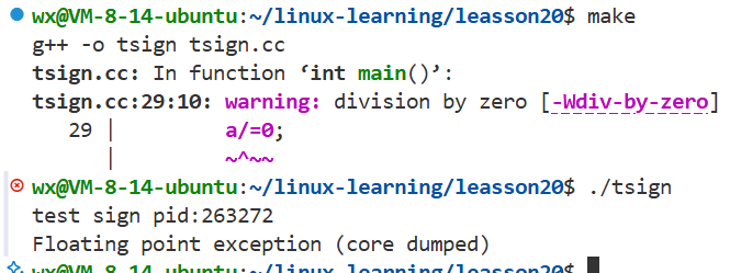 - 那么这个进程有PCB,进程状态等,这个进程还活着,那么这个进程就会被cpu继续调度,每次调度,OS就会发现信号位图的第八位被标记,有报错不能进行,OS就会继续给进程发送8号信号,每调度一次就发一次信号,所以就死循环了。