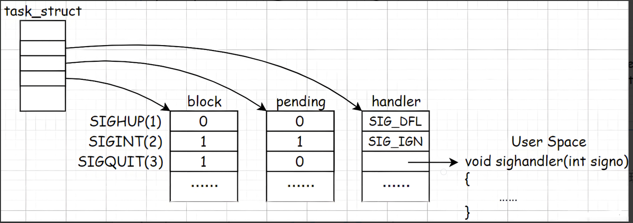 - 信号被保存在task_struct结构体中,使用位图结构保存收到的信号。
