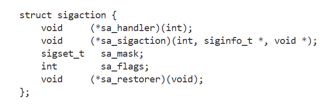 - 结构体中的第一个成员变量就是信号的处理函数指针。