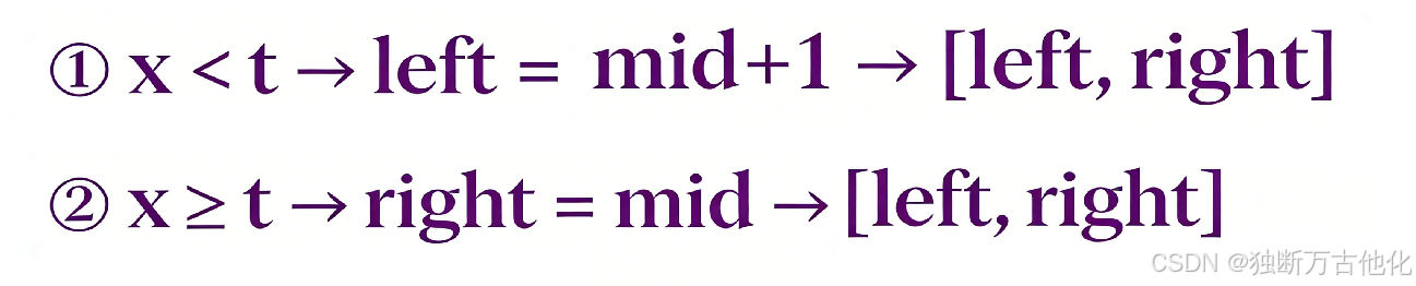 - 取右端点和左端点处理起来是一样的,只不过细节上不一样。当x 小于等于 target 时,left 指向 mid;当x 大于target时,right = mid - 1。