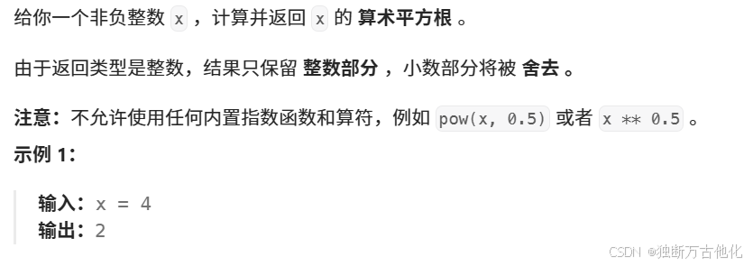 由题中只保留整数部分,随便找一个数mid平方可以得到将小于等于 x 作为一个区间,大于作为一个区间,由此可根据二段性使用二分。当小于等于时,将left指针指向mid处;大于时,right 指向 mid-1处。