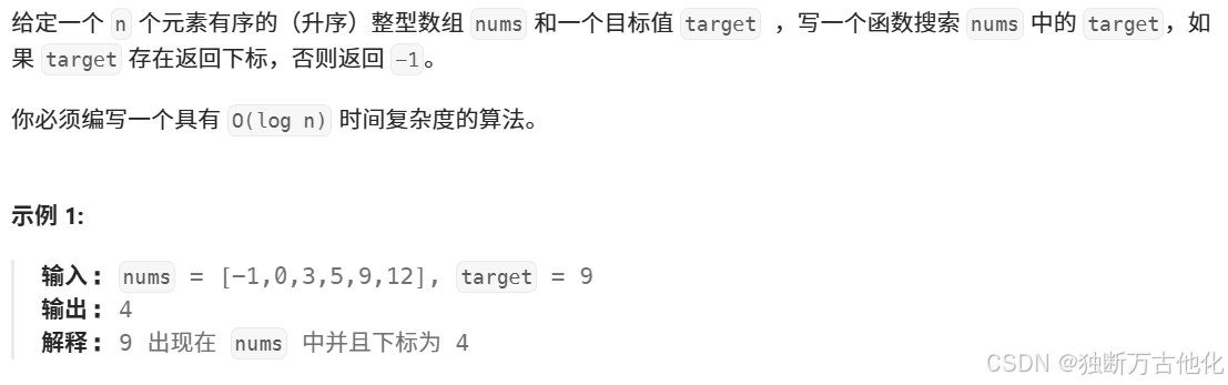 利用数组有序性,在数组中间找一个数,若该数大于 target ,则只需判断该数左边的数;若该数小于 target ,则只需判断该数右边的数。也就是将整个数组分为了两段,且只需对其中一段进行判断。然后进行这个循环判断。