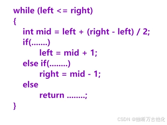 循环条件为left < right,为二分模板的条件。求中点操作和处理右端点一样,要使用 left + ( right - left ) / 2 ,否则将会出现死循环。