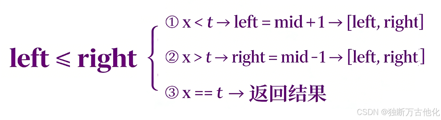 因为每次需要判断的区间数都是未知的,因此即使到 left == right 时,该数也是未知需要判断的,所以结束条件应为 left > right。所以整个核心的算法步骤如图: