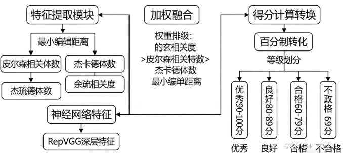 然后,使用预训练的RepVGG模型提取手写汉字的深层特征,并与模板字的特征进行比较,得到神经网络特征的相似度。最后,根据预设的权重对结构特征和神经网络特征进行加权融合,得到最终的评价得分。