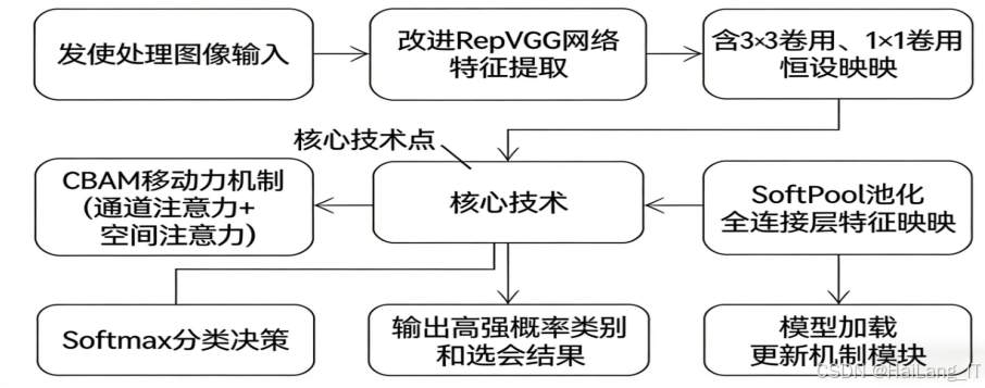 在本系统中,我们将CBAM注意力模块嵌入到RepVGG网络中,具体位置选择在每个阶段的末尾。这样的设计能够使模型在提取完该阶段的特征后,通过注意力机制增强重要特征,抑制无关特征,从而提升特征表示的质量。