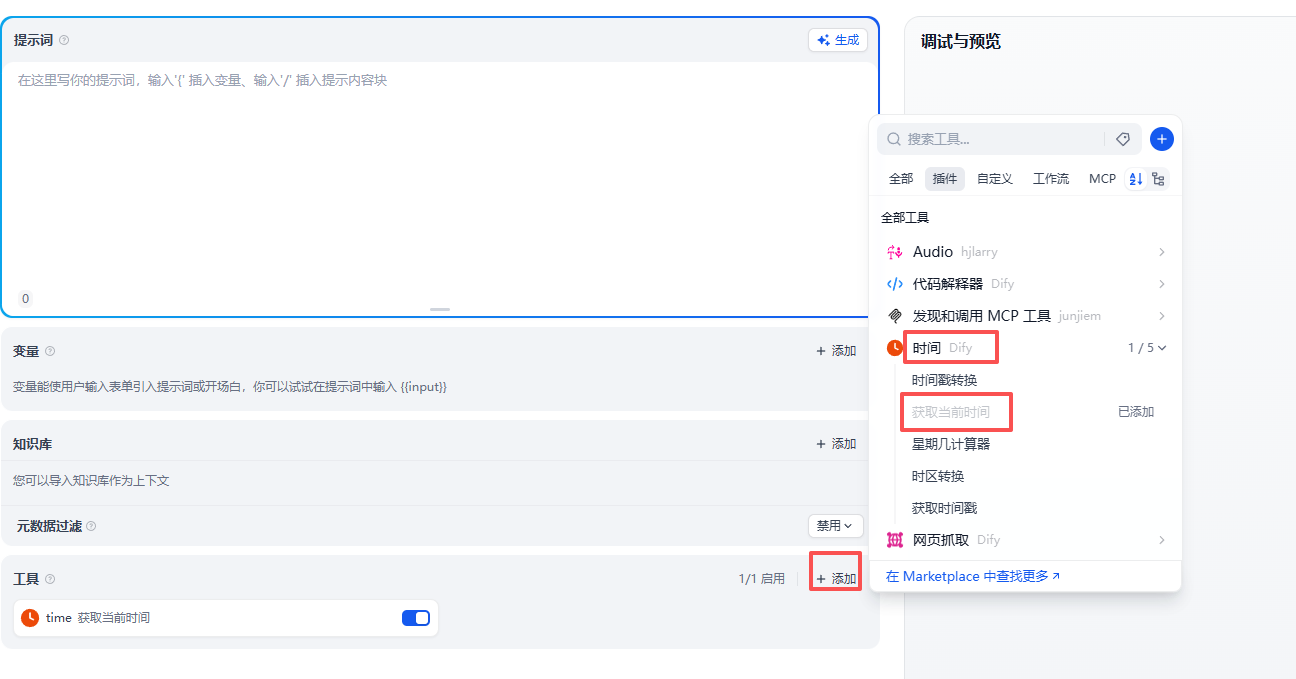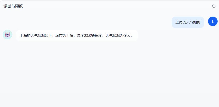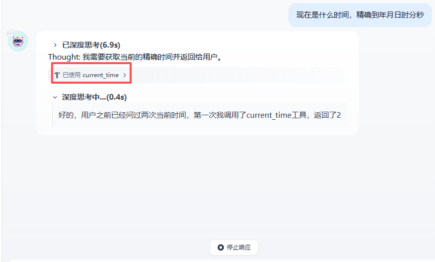 - 创建完成后,Agent可自动识别用户意图并调用对应工具,例如查询当前时间时,会触发工具调用逻辑获取结果: