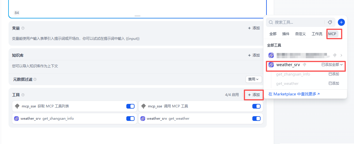 2.在Agent工具配置模块,点击「添加」,选中已注册的MCP工具函数,完成绑定: