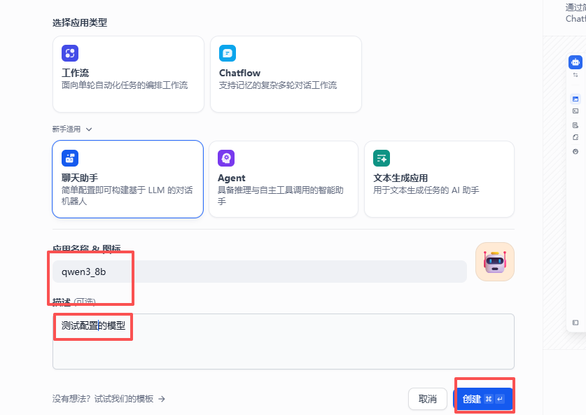 模型配置完成后,通过创建聊天助手应用测试连通性: