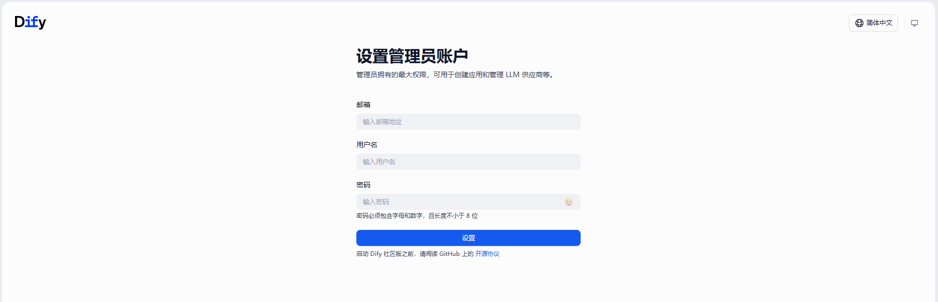 部署完成后,在本地浏览器访问 http://localhost/install,进入Dify初始化配置界面: