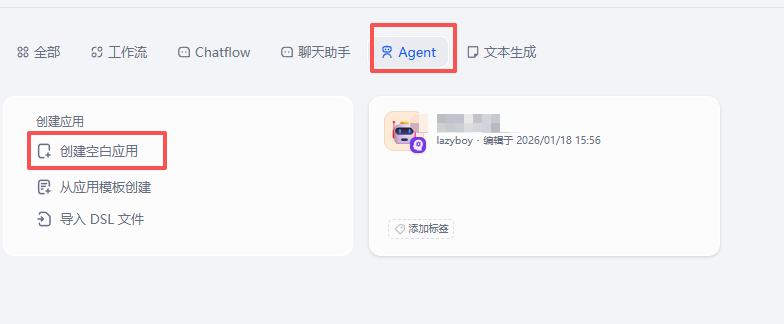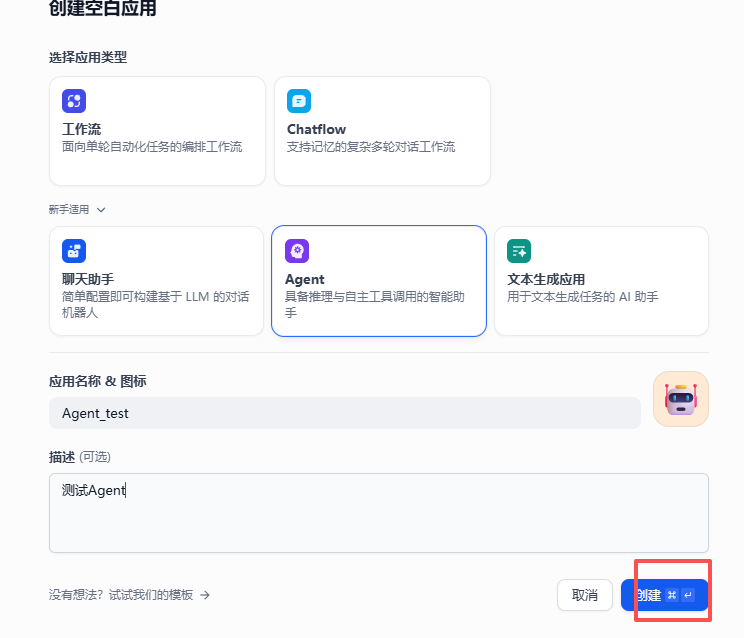 Dify的Agent具备知识库与第三方工具调用能力,可根据用户需求自动匹配工具分析问题(如查询实时时间需调用时间工具)。创建Agent应用步骤如下: