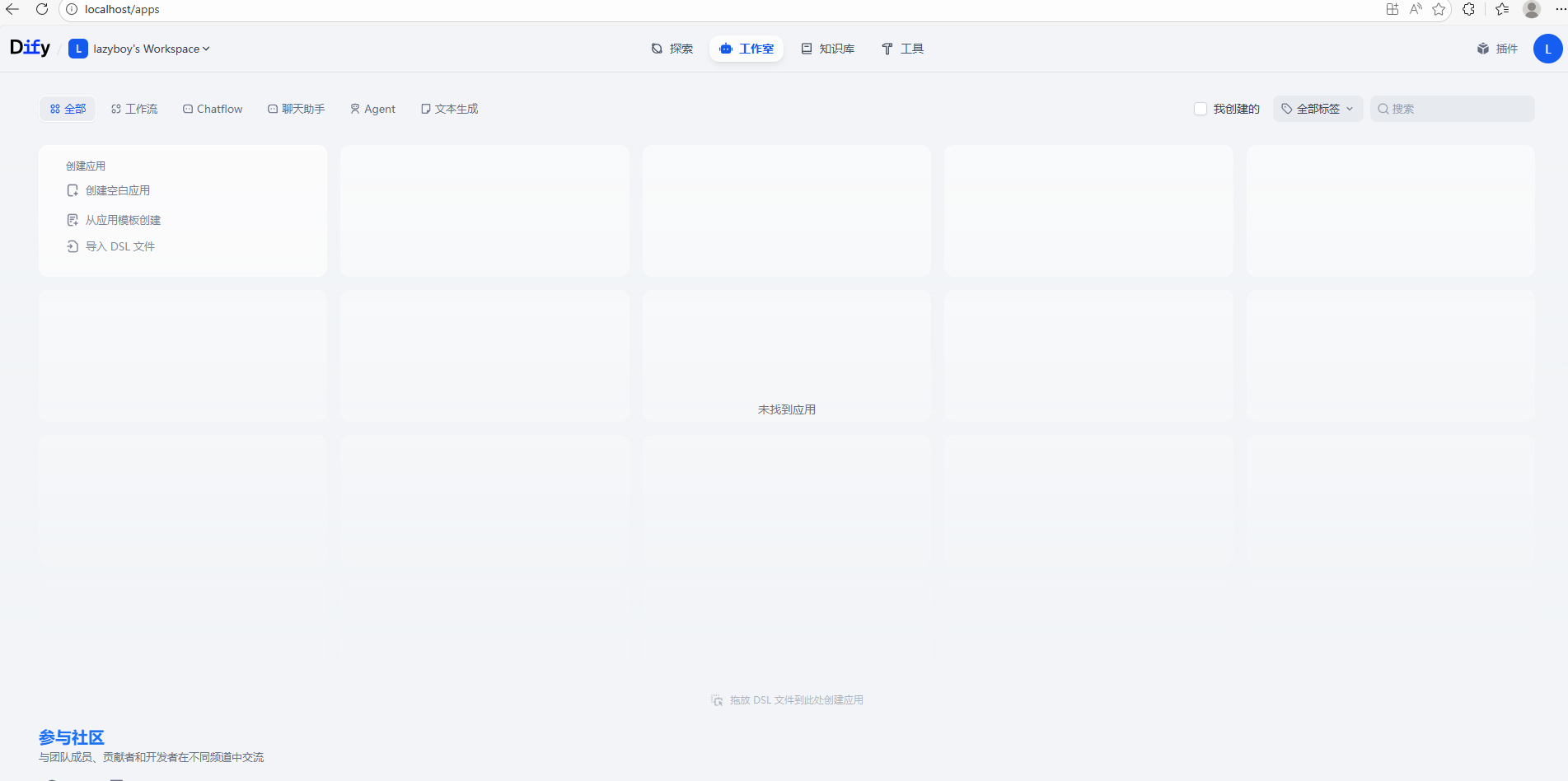 完成初始化配置并登录后,即可进入Dify主控制台,正式开启应用搭建: