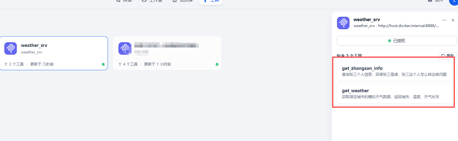 配置提交后,Dify会自动校验服务连通性,并加载MCP服务中注册的所有工具函数,完成服务与LLM平台的绑定: