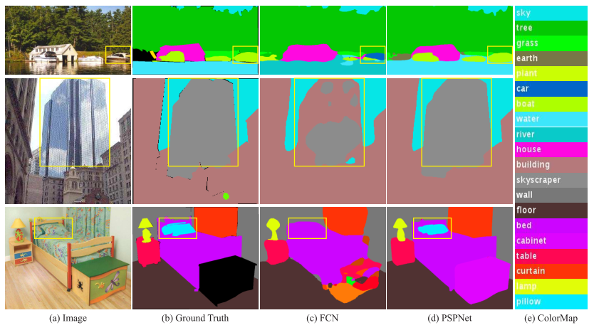 有些物体外观极度相似,比如"摩天大楼"和普通"建筑物"。FCN 经常在同一个物体上打出两个标签,一部分是摩天大楼,一部分是建筑物(如上图中第二行)。这显然是不合理的,一个物体应当属于一个类别 。