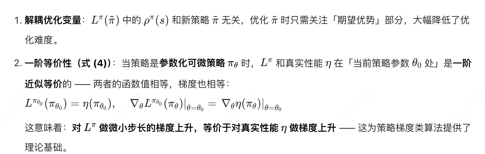[2. 消去了时间步 t,把性能差转化为「状态访问频率 × 状态 s 下新策略的期望优势」的求和。](#2. 消去了时间步 t,把性能差转化为「状态访问频率 × 状态 s 下新策略的期望优势」的求和。)