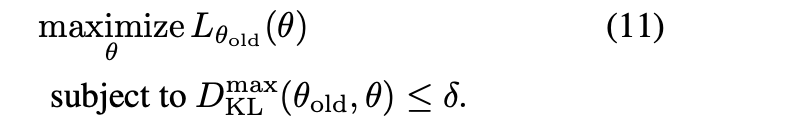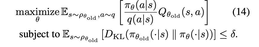 在实际应用中,若采用理论推导给出的惩罚系数 C,策略更新的步长会非常小。一种稳健实现大步长更新的方法是:对新旧策略之间的 KL 散度施加约束,也即设置一个信任区域约束,对应的优化问题如下: