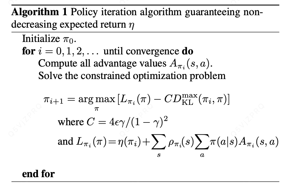 下一节中我们将提出的信任区域策略优化(TRPO)算法 ,是对算法 1 的一种近似。该算法采用 KL 散度约束替代惩罚项,从而能够更稳健地支持大步长策略更新。